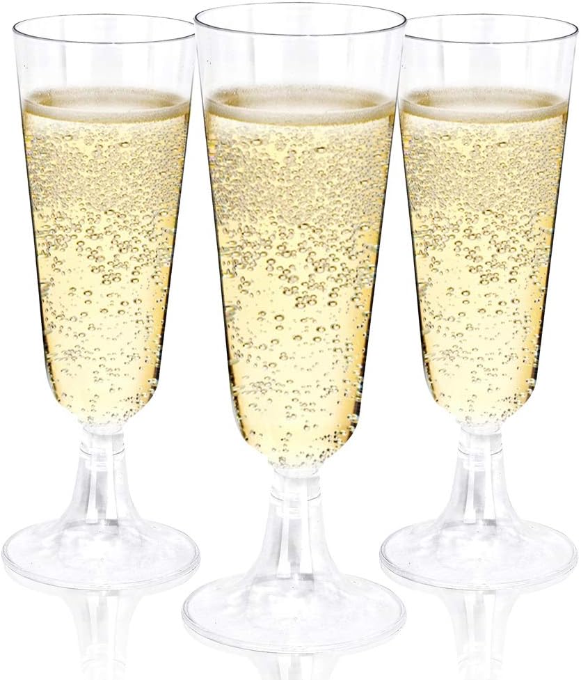 - QUITE PRACTICAL - 100 5oz clear plastic champagne glasses can accommodate large parties, which can make your party relaxed and carefree. You can sit down and enjoy your favorite drinks; and easily clean up the tragic situation after the party.